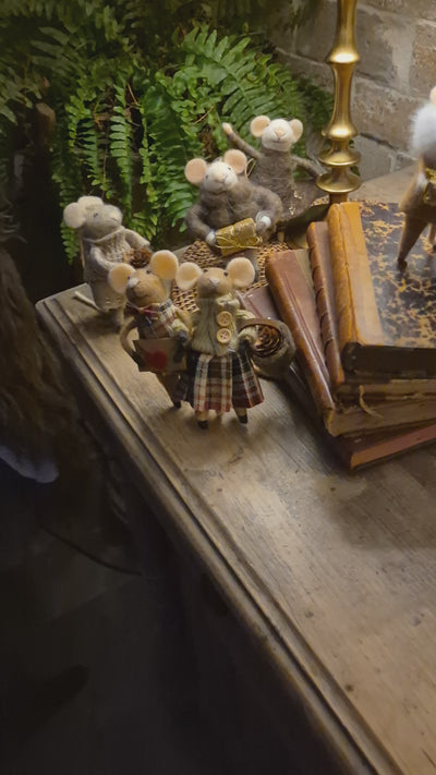 Our handmade mice are the sweetest little things we’ve seen in Christmas décor for a very long time. Poseable and hangable, they have us all dewy eyed, thinking of fairytales; of the night before Christmas when no creature was stirring and how they must have dressed so quietly in their finery – from beautiful bow ties to top hats, waistcoats and felted pantaloons, to accessories, ready to scamper out and play. Bless these little darlings; their little feet, arms and tails that are effortlessly movable, making them posable alone or as couples for display throughout your home, from sideboards to trees to table settings, where the mere sight of these little cuties will make you smile deeply, remembering what it’s like to believe in magic.
