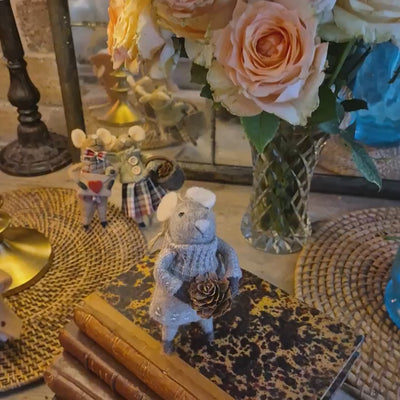 Our handmade mice are the sweetest little things we’ve seen in Christmas décor for a very long time. Poseable and hangable, they have us all dewy eyed, thinking of fairytales; of the night before Christmas when no creature was stirring and how they must have dressed so quietly in their finery – from beautiful bow ties to top hats, waistcoats and felted pantaloons, to accessories, ready to scamper out and play. Bless these little darlings; their little feet, arms and tails that are effortlessly movable, making them posable alone or as couples for display throughout your home, from sideboards to trees to table settings, where the mere sight of these little cuties will make you smile deeply, remembering what it’s like to believe in magic.