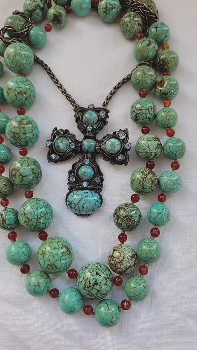 Gorgeous, oxidized silver necklace with a natural turquoise cross. Soured in LA from a vintage jewellery dealer, we fell hard for the clarity of colour of the turquoise stones and the edgy aesthetic of the oxidized cross and chain. Looks fabulous worn back with whites and denim.